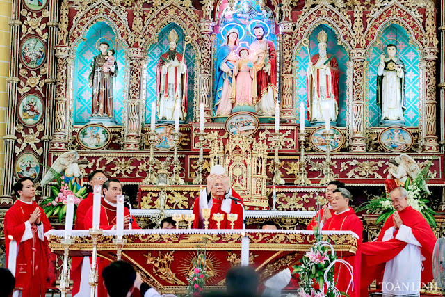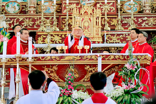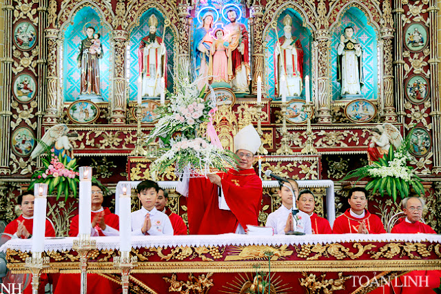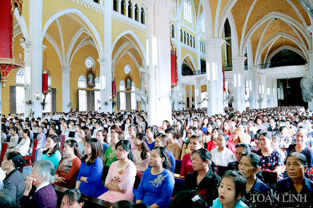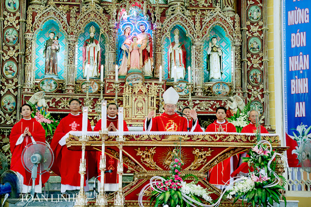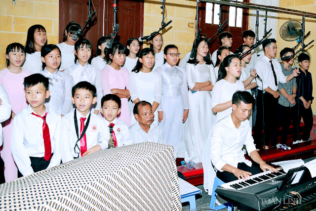 Đúng 9h, đoàn lễ nghi nghiêm trang, sốt sắng,từ TTMV tiến vào nhà thờ, trong tiếng kèn, tiếng trống và sau cùng là tiếng hát du dương của Ca đoàn với bài Ca nhập lễ đầy hân hoan, phấn khởi.