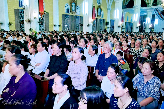 Mọi thành phần dân Chúa đều hiệp nhau trong tiếng ca, lời kinh, dâng Mẹ lời kinh Kính mừng là lời kinh tuyệt hảo, nói lên tâm tình biết ơn, lòng tràn ngập niềm vui của những người con khi được về bên Mẹ. Hàng chục ngàn tín hữu Giáo xứ Đền thánh đã quây quần quanh thánh đài, để cùng đội hoa đồng tiến dâng hoa kính Mẹ. Sau phần dâng hoa đồng tiến, cộng đoàn cùng sốt sắng chuẩn bị tâm hồn để bước vào phần cao điểm nhất trong ngày khai mạc tháng hoa hôm nay là Thánh lễ trọng thể mừng kính Đức Maria và thánh cả Giuse.
