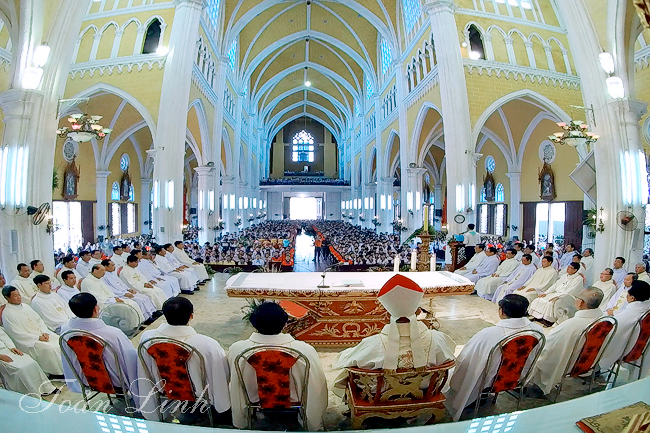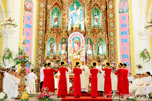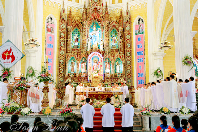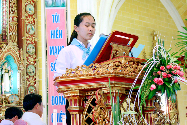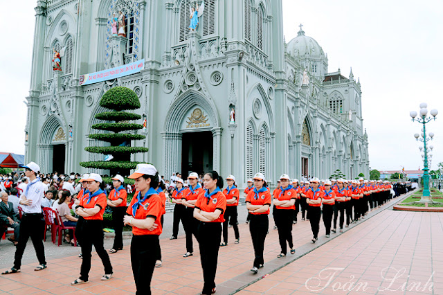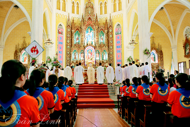 Đúng 9h45, đoàn lễ nghi tiến ra từ Trung tâm mục vụ, lên lễ đài để chuẩn bị cho giây phút cao điểm nhất của Đại hội là Thánh lễ chính tiệc vào lúc 10h00. Thánh lễ do Đức Cha Tôma Giáo phận chủ sự, với sự hiện diện của đông đảo quý Cha trong giáo phận.